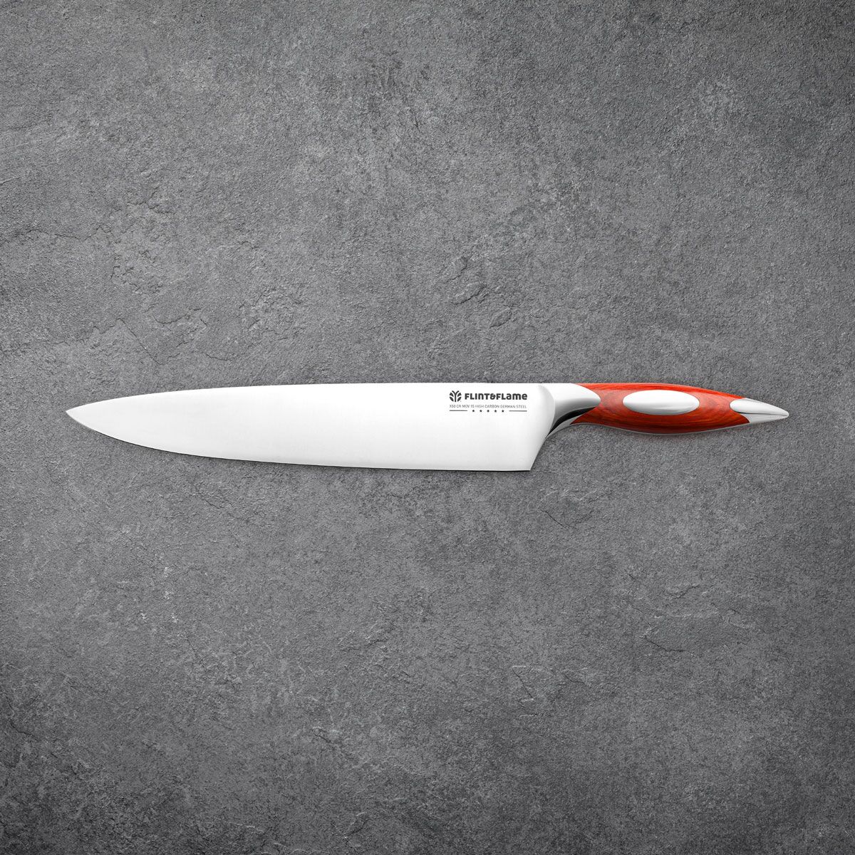 The professional chef’s go to knife! With its 10” blade, this knife is larger and heavier than most and features a nice deep heel for better utility. Perfect for larger meats, fruits or vegetables like melons and squashes. Longer blade makes for faster cuts. This Flint & Flame knife arrives in our lockable blade cover.