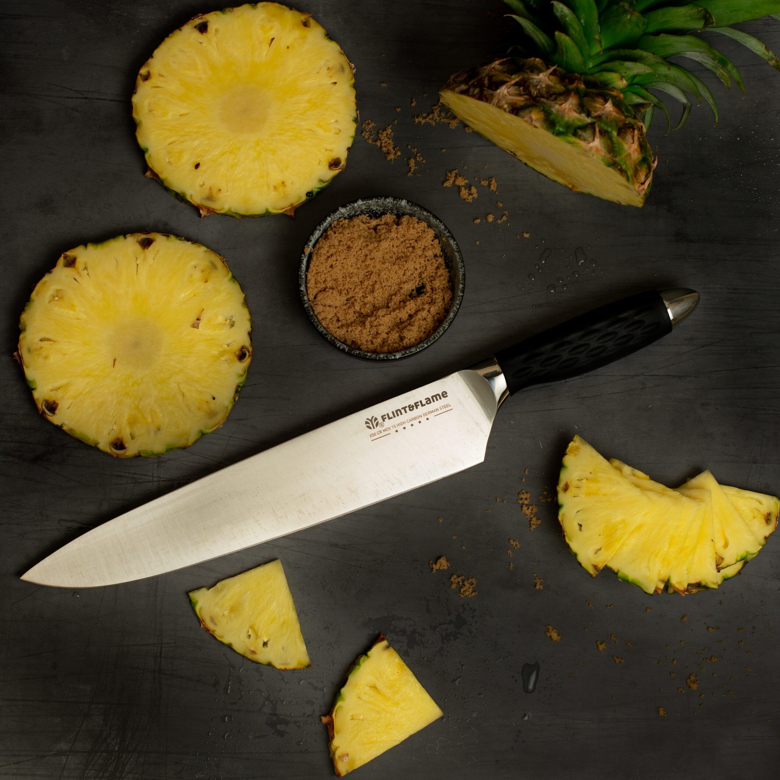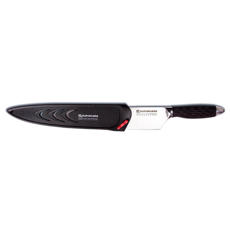 The Pro Series 10” Chef knife features our distinctive high impact silicone handle for extra grip with a modern appearance. Perfect for the home & BBQ. The modern contempory design makes it perfect for Chefs & home cooks alike. The large 10″ Chef knife is the workhorse for Chefs & BBQ enthusiasts when handling anything of size. It’s larger and heavier than most and features a nice deep heel. This Flint & Flame knife arrives in our lockable blade cover.