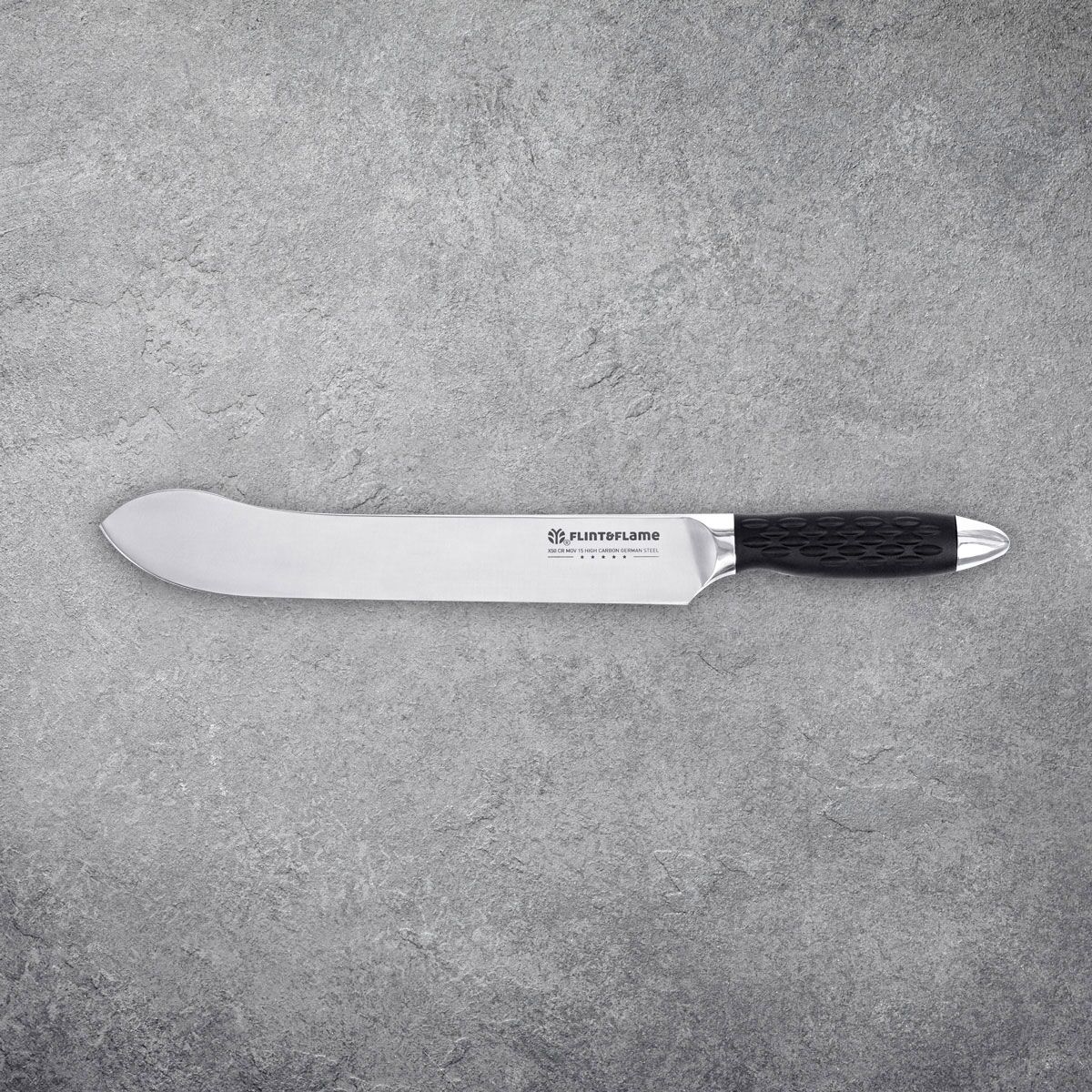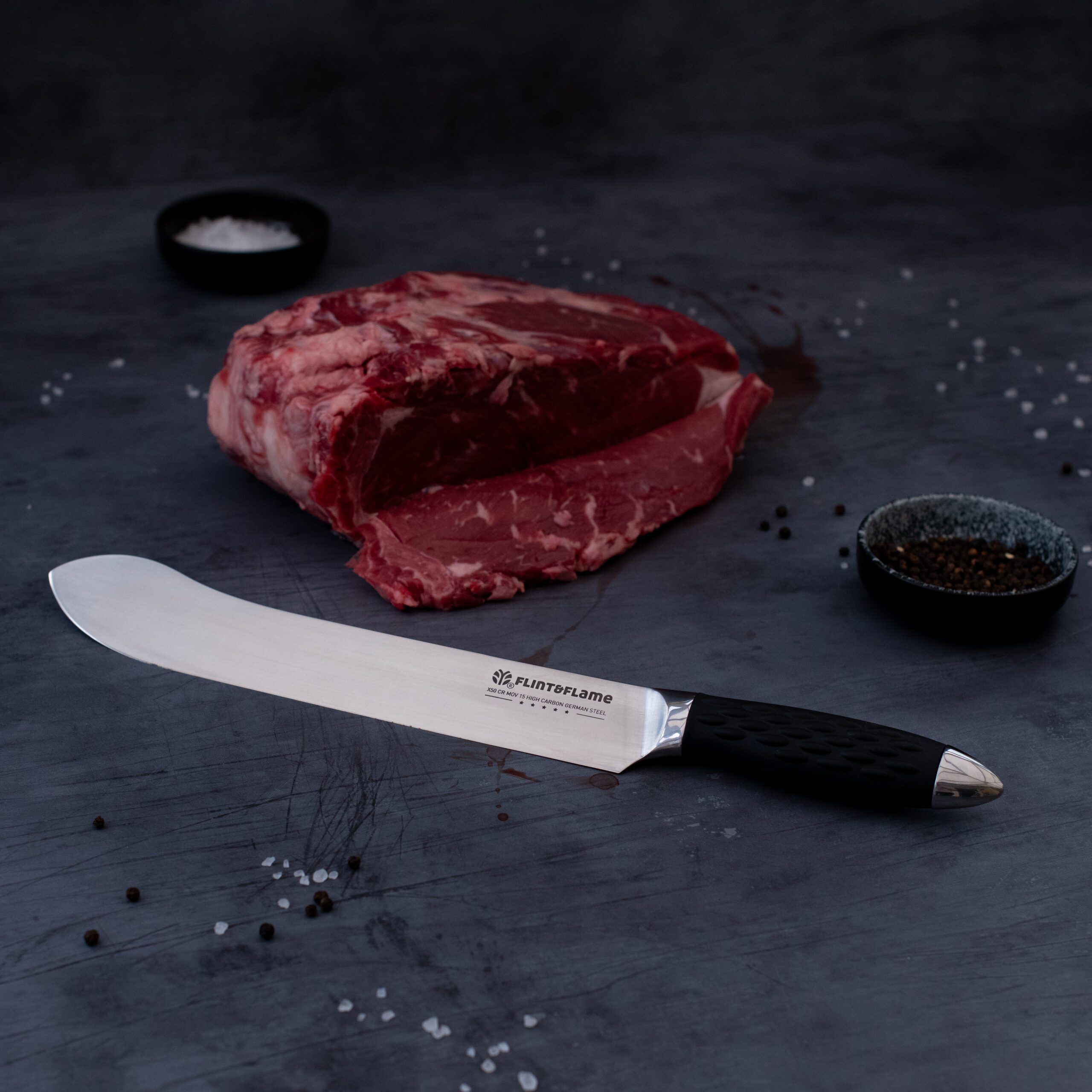 The NEW Pro Series 10″ Steaking Knife features our distinctive high impact silicone handle for extra grip with a modern appearance. It’s the perfect steaking knife for preparing large cuts of meat, game and larger fish like tuna. This Flint & Flame knife arrives in our lockable blade cover.