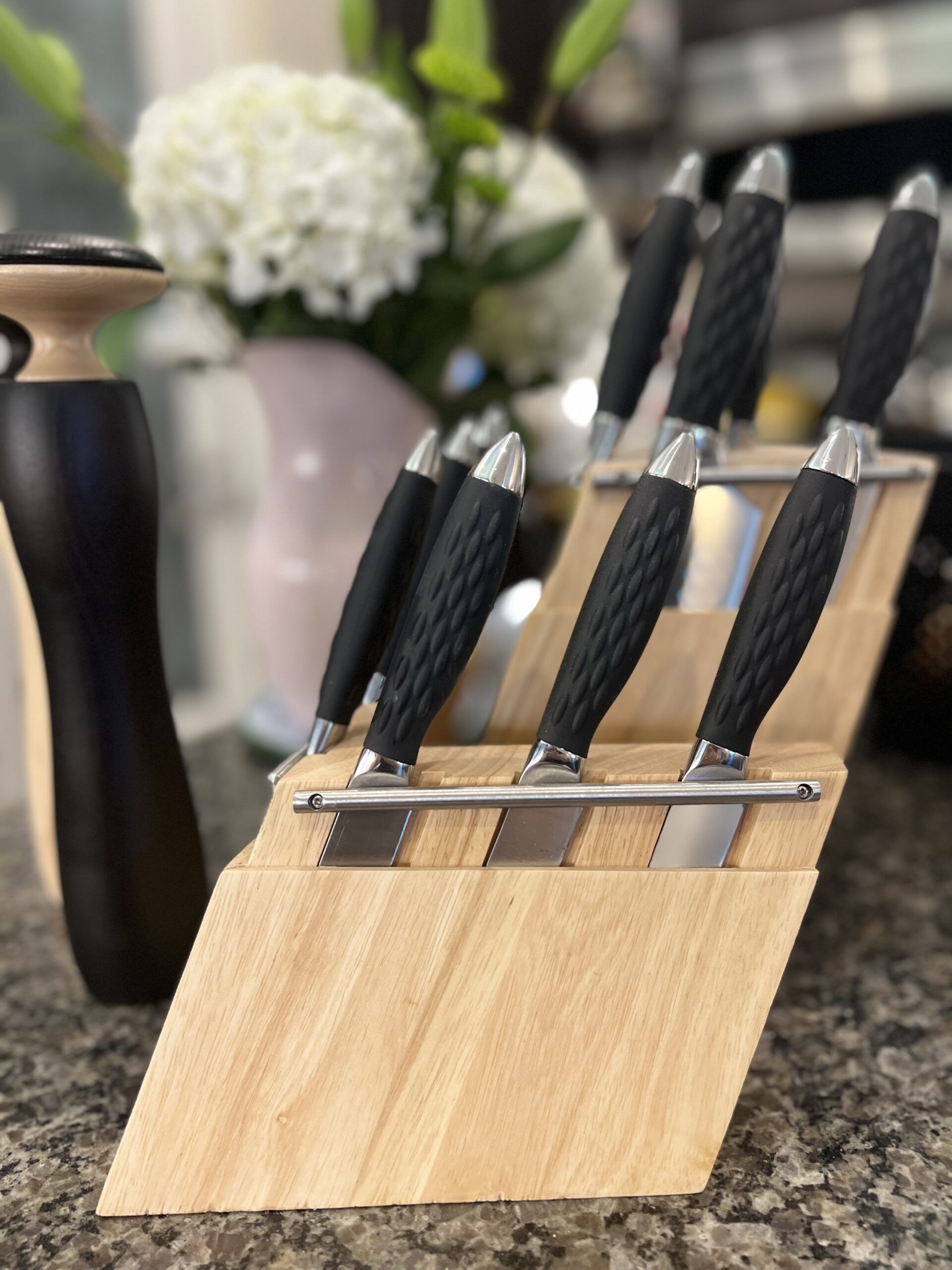 The PRO Series Sportsman Collection is the ultimate block set for those who live life with a touch of style—and grip. Designed with our signature high-impact silicone handles, each knife offers a confident hold with a sleek, modern look. Perfect for grilling aficionados, outdoor enthusiasts, or anyone who prefers their kitchen with an urban feel, this set has you covered. The two-piece rubberwood block is both clever and convenient, with a detachable front section that holds your steak knives right where you need them.