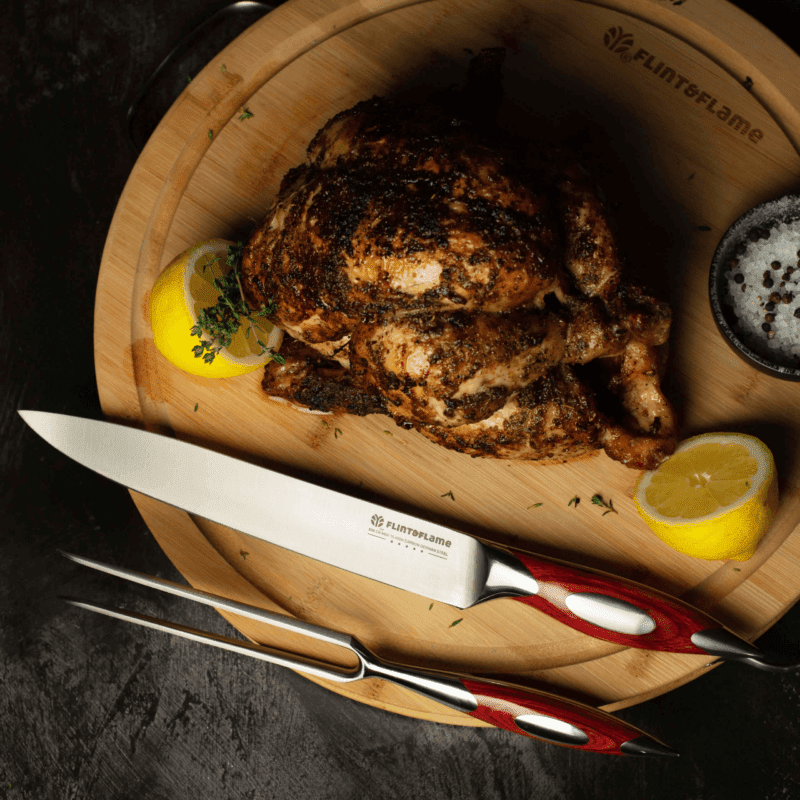 The 9” Carving Knife & Fork are presented in a beautiful wood presentation case. Slightly longer than most carving blades, the 9” Carving Knife will ensure easy and thin slices when preparing meals of poultry, ham, roasts, as well as larger game. Its razor-sharp point makes it ideal for both boned and boneless joints. And the thinner blade allows for precision and maneuverability to achieve that perfect cut as you plate dinner.