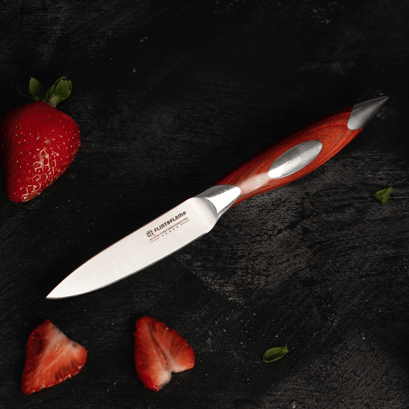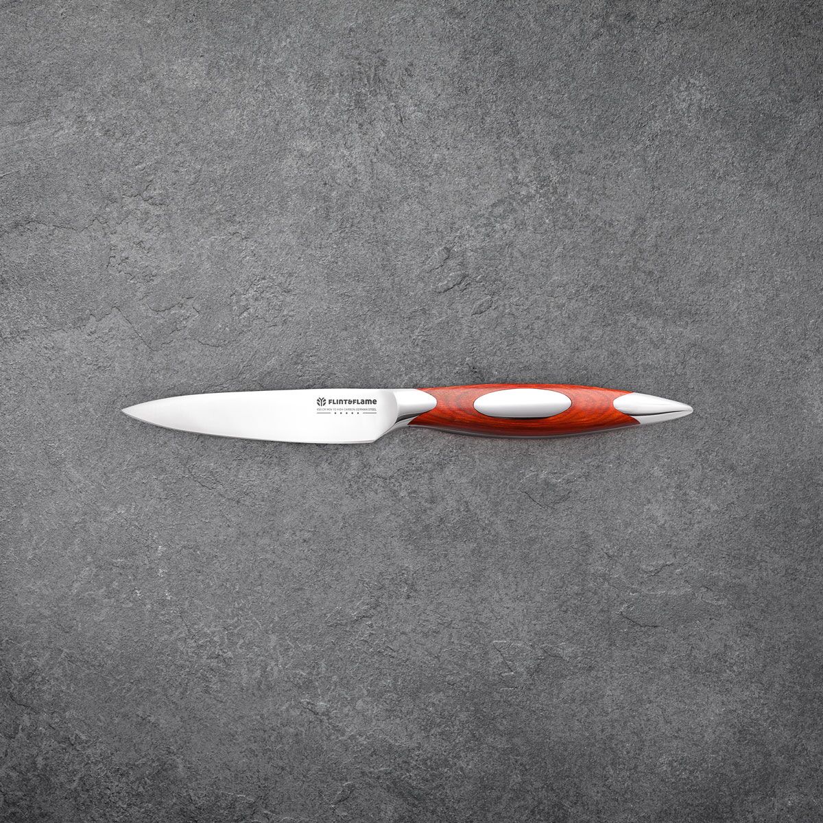 No kitchen is complete without one! Great for peeling, paring and garnishing. Its shorter blade allows for precise and decorative cuts. This Flint & Flame knife arrives in our lockable blade cover.