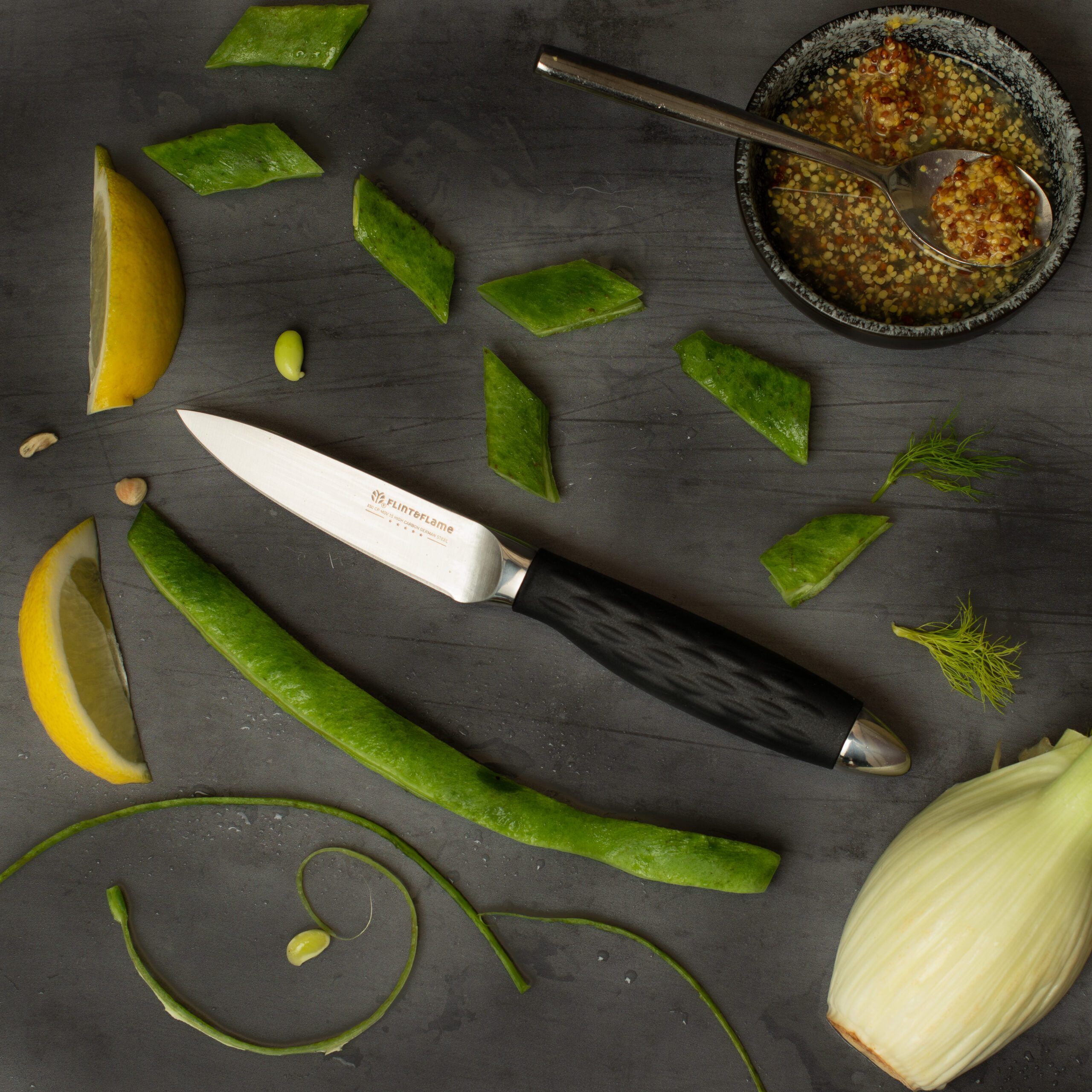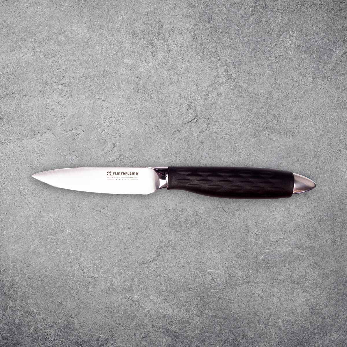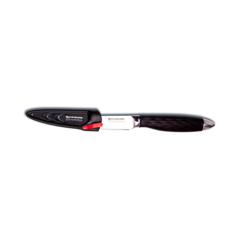 The Pro Series 3.5” Paring knife features our distinctive high impact silicone handle for extra grip with a modern appearance. It is considered one of the must have knives in any knife collection. Great for peeling, paring and garnishing. Its shorter blade allows for precise and decorative cuts. This Flint & Flame knife arrives in our branded blade cover.