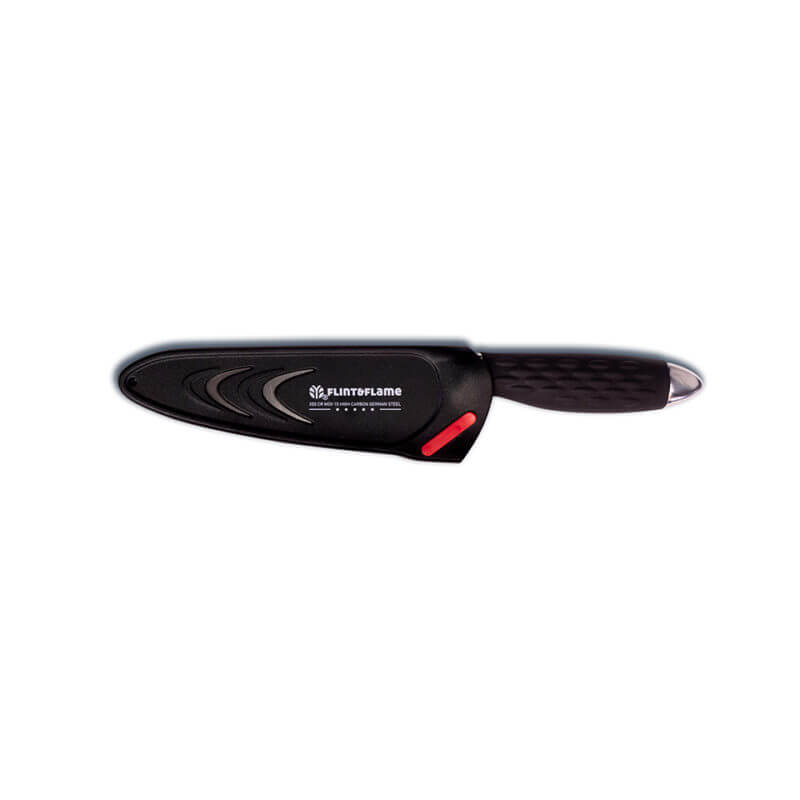 The perfect size kitchen knife! It’s shorter blade allows for greater control and nimbleness, especially with chopping, slicing, dicing and mincing smaller vegetables, fruits and cuts of meat. This Flint & Flame knife arrives in our lockable blade cover.