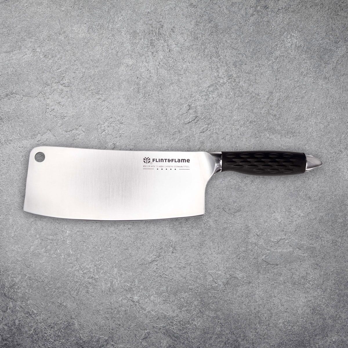 The Pro Series 8″ Meat Cleaver features our distinctive high impact silicone handle for extra grip with a modern appearance. This traditional Cleaver design will make light work of any joint of meat or tough root vegetable. Its blade is very deep, making it safe to use when chopping or crushing. It features a sharp point that can be used for scoring joints of meat and chopping through poultry bones. This knife is a fantastic tool to have for those moments when you need something a little more heavy-duty. This Flint & Flame knife arrives in our lockable blade cover.