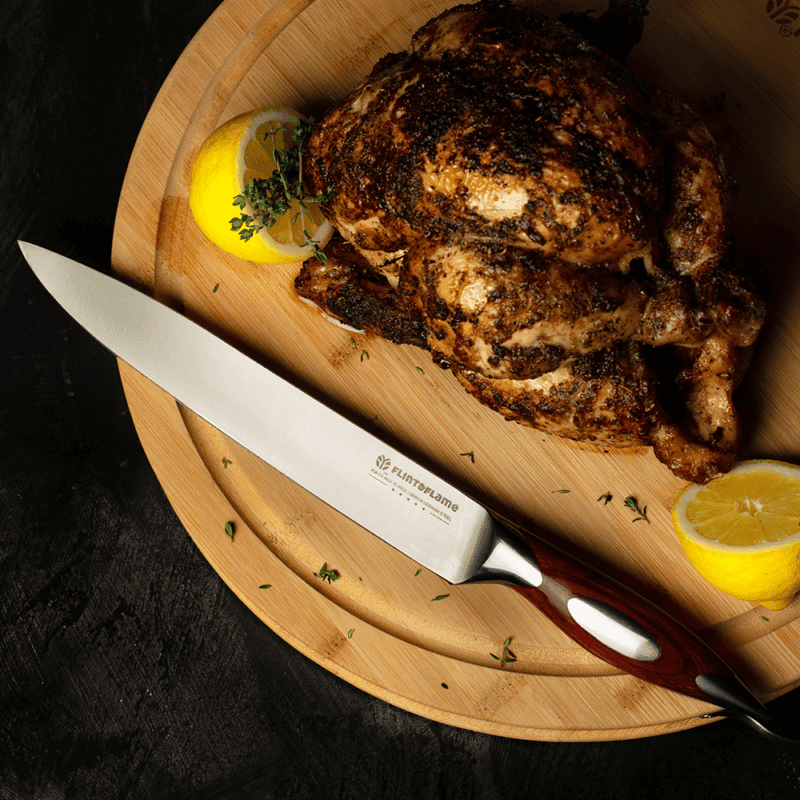 The 9″ Carving knife for Thanksgiving turkey or Sunday family roast presented in our velvet lined black card box. Slightly longer than most carving blades, the 9” Carving Knife will ensure easy and thin slices. Its razor-sharp point makes it ideal for both boned and boneless joints. And the thinner blade allows for precision and maneuverability to achieve that perfect cut as you plate dinner.