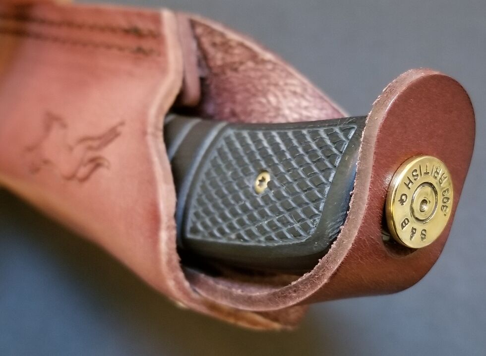 After much deliberation, Sandvik 12 C 27 steel was settled on for the blade because of its perfect balance of properties. The Swedish steel is hard enough to take and hold a good edge, but has sufficient carbon to resharpen easily. 3mm thick, the blade is rigid and extremely strong. It is stainless enough to resist the corrosive elements of blood, and puts up with going through the dishwasher repeatedly. The handle is made from G10, a woven fibreglass style compound that is resistant to almost everything you can throw at it. The shotgun style checkering and vertical grooves give amazing grip, even when skinning a fatty Wild Boar. The slim Brass bolster is aesthetically pleasing and helps you find the knife if you put it down in the grass or on the ground. The signature cartridge in the butt of the knife is a British .303 by Hornady. This great calibre is an important part of Mike’s heritage and of course is a rimmed round, so it grips the tab of the sheath to secure the knife.